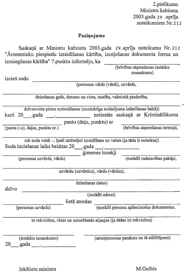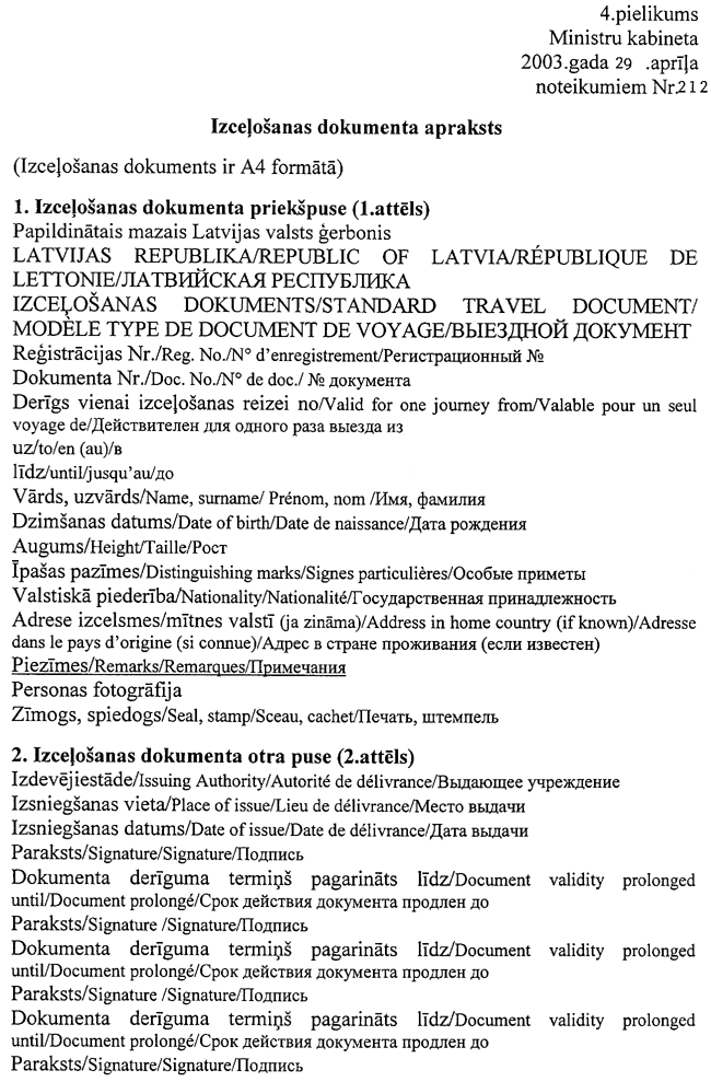 Ministru kabineta 2003. gada 29. aprīļa noteikumi Nr. 212 "Ārzemnieku piespiedu izraidīšanas kārtība, izceļošanas dokumenta forma un tā izsniegšanas kārtība". Publicēts oficiālajā laikrakstā "Latvijas Vēstnesis", 30.04.2003., Nr. 65 https://www.vestnesis.lv/ta/id/74349-arzemnieku-piespiedu-izraidisanas-kartiba-izcelosanas-dokumenta-forma-un-ta-izsniegsanas-kartiba