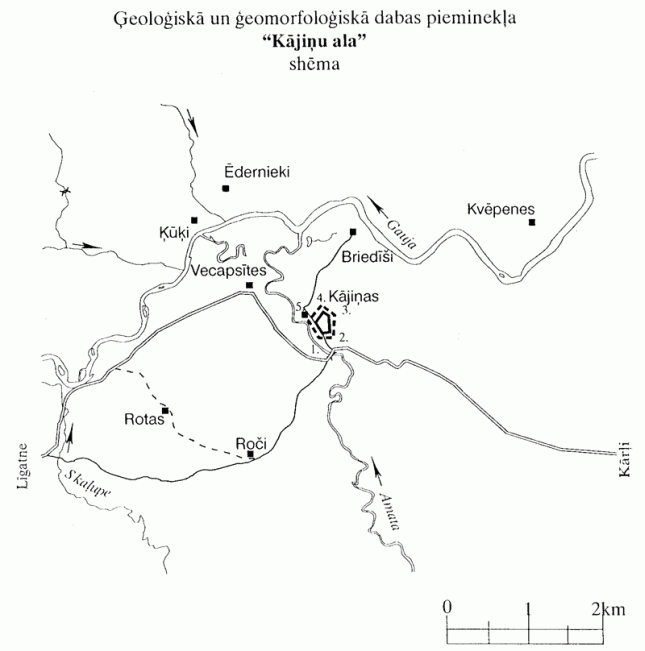 80 m uz austrumiem pa nogāzi lejup, tad 170 m uz dienvidiem pa lēzenu kritumu līdz Gaujai |
