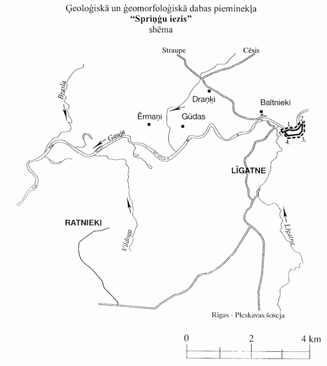 150 m uz dienvidiem un 150 m uz dienvidrietumiem lejup pa nogāzi līdz Gaujai |