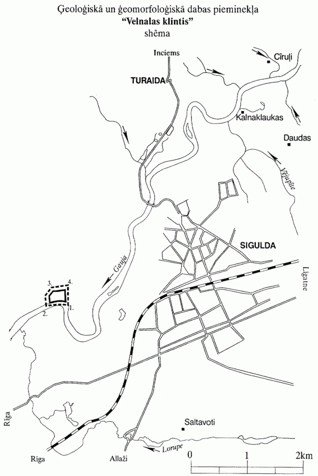 No punkta Gaujas labajā krastā uz Siguldas mežniecības 13. un 14.kvartāla robežas 210 m uz ziemeļiem augšup pa nogāzi līdz tās augšējai krotei |