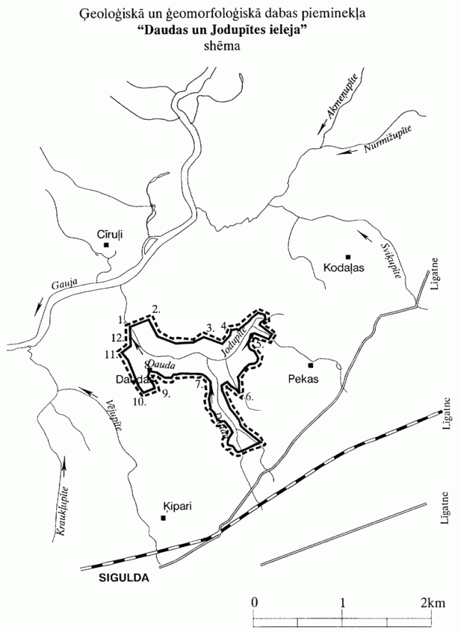 Gar saimniecības “Jodas” un Siguldas mežniecības robežu, apliecot Jodupītes gravveidīgo ieleju, līdz saimniecību “Jodas” un “Pekas–2” robežas ziemeļu punktam |