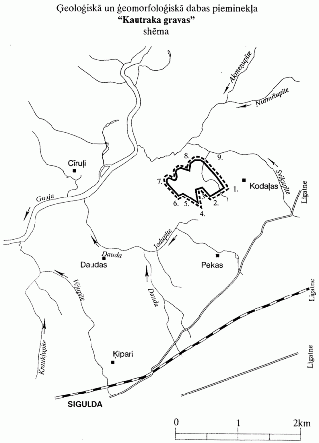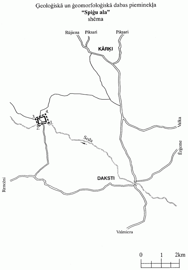 200 m uz dienvidiem, dienvidaustrumiem, tad gar stāvās nogāzes augšējo malu paralēli Daudas tecei 700 m uz austrumiem |