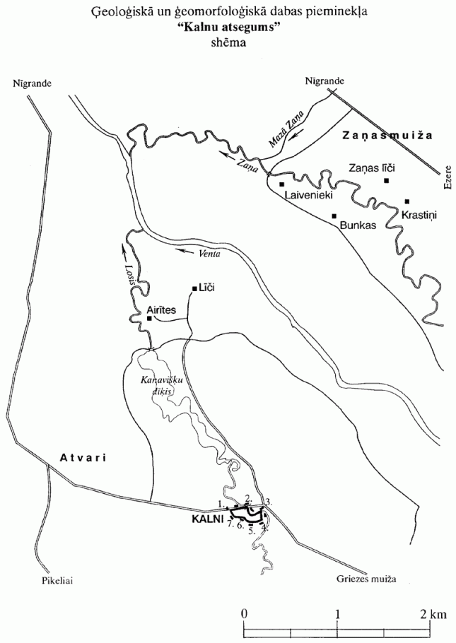 160 m uz ziemeļiem, ziemeļaustrumiem un 60 m uz austrumiem pa stāvā krituma un tam sekojošā lēzenā krituma robežlīniju, pēc tam 300 m uz dienvidaustrumiem, šķērsojot strautu, līdz saimniecības “Kodaļas-1” ziemeļrietumu robežai |
