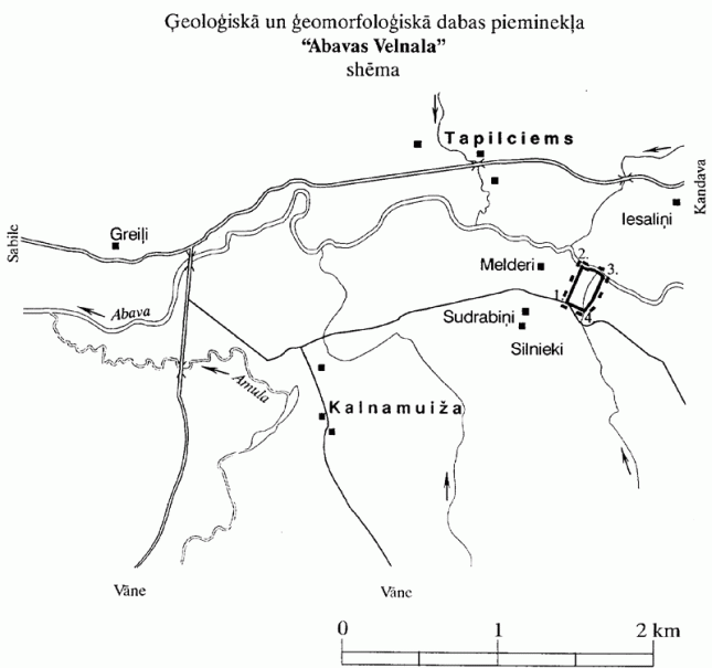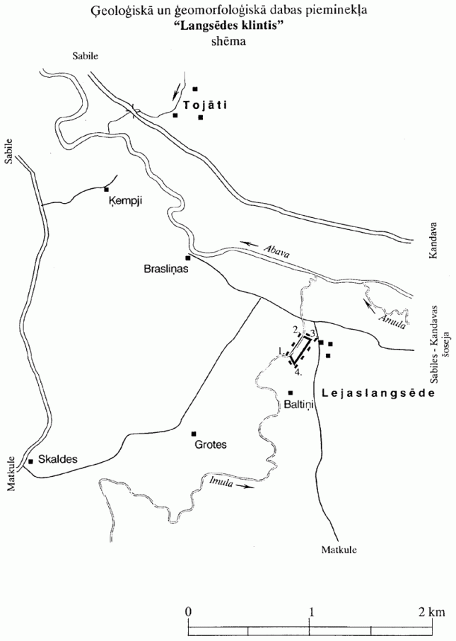 Apmēram 400 m uz ziemeļiem, ziemeļaustrumiem gar Laņģupīti līdz sākumpunktam |