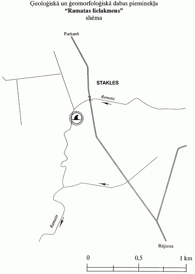450 m uz dienvidiem, dienvidrietumiem un 140 m uz dienvidaustrumiem gar Salacu augšup pret straumi, šķērsojot stigu, kas no dienvidu, dienvidaustrumu puses pienāk pie upes |