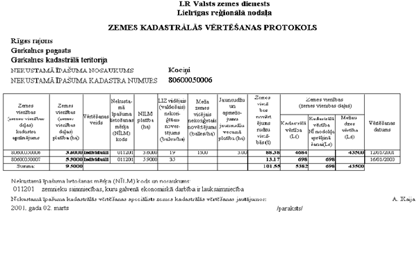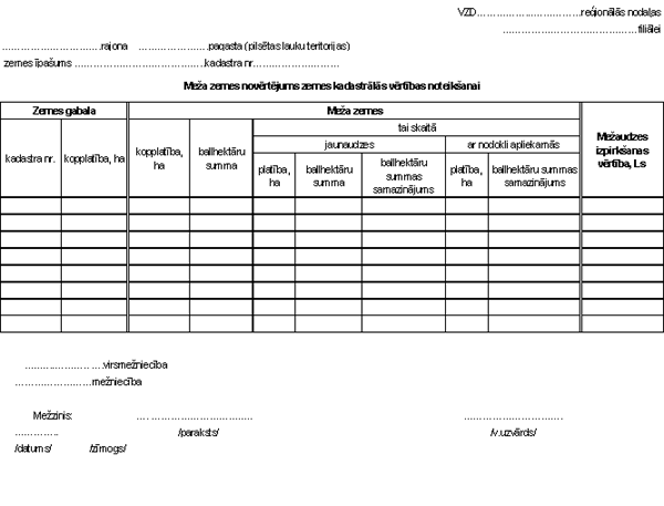 I. Vispārīgie noteikumi 1. Lauku apvidu zemes kadastrālo vērtību masveida vērtēšanā nosaka saskaņā ar Ministru kabineta 1999.gada 6.jūlija noteikumiem Nr.244 "Lauku apvidu zemes kadastrālās vērtēšanas noteikumi", Ministru kabineta 2000.gada 19.decembra noteikumiem Nr.466 "Grozījumi Ministru kabineta 1999.gada 6.jūlija noteikumos Nr.244 "Lauku apvidu zemes kadastrālās vērtēšanas noteikumi" (turpmāk tekstā - Noteikumi), MK 1999.gada 25.maija noteikumiem Nr.193 "Nekustamo īpašumu kadastrālo vērtību aktualizācijas kārtība", MK 1998.gada 5.maija noteikumiem Nr. 166 "Nekustamā īpašuma lietošanas mērķu klasifikācija" un dotajiem metodiskajiem norādījumiem . 2. Metodiskie norādījumi nosaka lauku apvidu zemes masveida kadastrālās vērtēšanas procesa (turpmāk - zemes vērtēšana masveidā) organizāciju, vērtēšanas darbu izpildes kārtību, kadastrālo vērtību aktualizācijas kārtību, kadastrālo vērtību uzskaites, kontroles un glabāšanas kārtību. 3. Zemes īpašuma, lietojuma un zemes nomas (turpmāk tekstā - zemes vienības) zemes kadastrālo vērtību masveida vērtēšanā (turpmāk - zemes vērtību) nosaka atbilstoši Nekustamā īpašuma valsts kadastra reģistrā reģistrētajam nekustamā īpašuma (turpmāk tekstā -NĪ) lietošanas mērķim, NĪ lietošanas mērķa eksplikācijai un NĪ lietošanas tiesību apgrūtinājumiem (turpmāk tekstā - aprobežojumiem (ierobežojumiem)). 4. Lauku apvidu zemes vērtību aktualizāciju veic VZD reģionālās nodaļas NĪ kadastrālās vērtēšanas speciālists zemes kadastrālās vērtēšanas jautājumos (turpmāk tekstā - vērtēšanas speciālists) MK 1999.gada 25.maija noteikumu Nr.193 "Nekustamo īpašumu kadastrālo vērtību aktualizācijas kārtība" noteiktā kārtībā. II. Lauku apvidu zemes vērtēšanas masveidā organizācija un zemes vērtību aktualizācijas kārtība 5. Lauku apvidu zemes kadastrālās vērtības aprēķins notiek Nekustamā īpašuma valsts kadastra reģistra (turpmāk- NĪVKR) vērtēšanas daļā. 6. NĪVKR vērtēšanas daļa paredz zemes kadastrālās vērtības un zemes kadastrālās vērtības NĪ nodoklim: 6.1. automātisku pārrēķinu, 6.2. aprēķinu, pēc vērtēšanas datu ievades vai aktualizācijas. 7.NĪVKR vērtēšanas daļa nodrošina automātisku zemes kadastrālās vērtības un zemes kadastrālās vērtības NĪ nodoklim pārrēķinu atbilstoši normatīvajiem dokumentiem gadījumos, ja NĪVKR izmaina: 7.1. zemes vienības eksplikācija (kopplatība vai zemes lietošanas veidu platības): 7.1.1. vērtēšanas metodēm, kas saistītas ar lauksaimniecībā izmantojamās zemes un meža zemes kvalitatīvo novērtējumu: · ja izmaiņas skar lauksaimniecībā izmantojamās zemes vai meža zemes platību, tad automātisks pārrēķins notiek, ja minētās izmaiņas nav lielākas par 5% (ieskaitot); · ja izmaiņas neskar lauksaimniecībā izmantojamās zemes vai meža zemes platības, tad pārrēķins notiek pie jebkurām platību izmaiņām; 7.1.2. ja vērtēšanas metode nav saistīta ar lauksaimniecībā izmantojamās zemes un meža zemes kvalitatīvo novērtējumu - pie jebkurām zemes vienības platību izmaiņām. 7.2. NĪ lietošanas mērķis, ja tā maiņa nav saistīta ar attiecīgā NĪ lietošanas mērķa vērtēšanai pielietojamās metodes maiņu (1.pielikums), 7.3. zemes lietošanas aprobežojumi (ierobežojumi), 7.4. informācija no Valsts meža dienesta datu bāzes pēc regulārās datu apmaiņas. 8. Ja automātiskais kadastrālās vērtības pārrēķins, pēc 7.punktā minētajām izmaiņām, skar zemes vienības, kuras ir vērtētas pielietojot individuālo vērtēšanas veidu, tad: 8.1. kadastrālās vērtības pārrēķins notiek pielietojot masveida vērtēšanas veidu, 8.2. valdošais lauksaimniecībā izmantojamās zemes kvalitatīvais novērtējums ballēs tiek aprēķināts ar vienas balles precizitāti no LIZ sadalījuma pusklasēs, 8.3. inženiertehniskā nodrošinājuma koeficents tiek saglabāts tāds, kāds ir noteikts individuālajā vērtēšanas veidā. 9. Gadījumos, kad pēc NĪVKR reģistrētajām kadastrālo vērtību ietekmējošām izmaiņām nav iespējams automātisks zemes kadastrālās vērtības pārrēķins, tad zemes vienības kadastrālā vērtība kļūst neaktuāla. 10. Vērtēšanas speciālists veic: 10.1. zemes vienības pirmreizējo kadastrālo vērtēšanu - gadījumos, ja NĪVKR ir reģistrēta jauna zemes vienība; 10.2. zemes kadastrālo vērtību aktualizāciju, ja NĪVKR reģistrētās kadastrālo vērtību ietekmējošās izmaiņas nepieļauj automātisku vērtības pārrēķinu; 10.3. pēc pasūtītāja pieprasījuma sagatavo kadastrālās vērtēšanas protokolu (2.pielikums), izziņu par zemes kadastrālo vērtību (3.pielikums), izziņu par zemes kadastrālo vērtību nekustamā īpašuma nodokļa aprēķināšanai (4.pielikums). 11. Ar NĪ nodokli apliekamo zemes vienību pirmreizējai vērtēšanai vai aktualizācijai nepieciešams saraksts no NĪVKR (ne retāk kā divreiz mēnesī) - "Zemes vienību un zemes vienību daļu saraksts, kurām nepieciešama vērtēšanas datu aktualizācija" (turpmāk tekstā- aktualizācijas saraksts) (5.pielikums). 12. Vērtēšanas speciālists aktualizācijas sarakstā uzskaitītajām zemes vienībām nosaka vērtēšanai nepieciešamos datus un ievada tos NĪVKR vērtēšanas daļā. Aktualizācijas sarakstā vērtētājs atzīmē datumu, kad konkrētās zemes vienības vērtēšanas dati ievadīti vērtēšanas daļā un parakstās. 13. Vērtēšanas speciālists sakārto zemes masveida vērtēšanas materiālus metodisko norādījumu VIII. daļā noteiktā kārtībā un nodod arhīvā. III. Zemes vērtēšanas masveidā darbu izpildes kārtība lauksaimniecības, mežsaimniecības, ūdenssaimniecības vajadzībām izmantojamām zemēm 14. Darbam nepieciešamie materiāli: