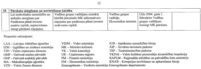 3. Ekonomikas ministrijai (Latvijas Attīstības aģentūrai) līdz 2004.gada 1.februārim iesniegt Ministru kabinetā informatīvu ziņojumu par pasākumu plāna izpildes gaitu un citiem pasākumiem, kas nepieciešami uzņēmējdarbības vides uzlabošanai.