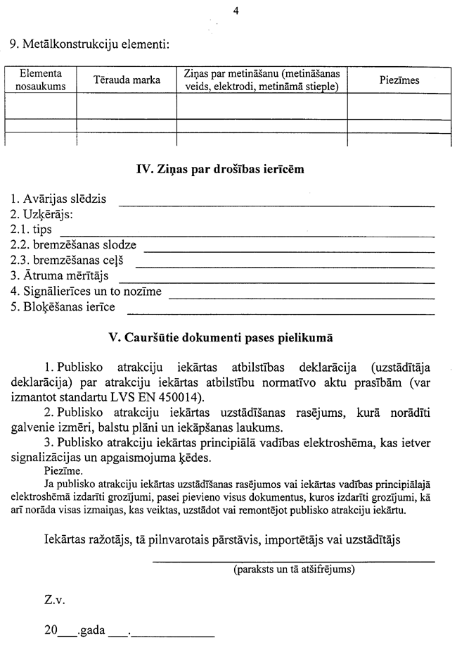 14. Nododot vai iznomājot atrakciju iekārtu citam valdītājam, nodod arī iekārtas tehnisko pasi.