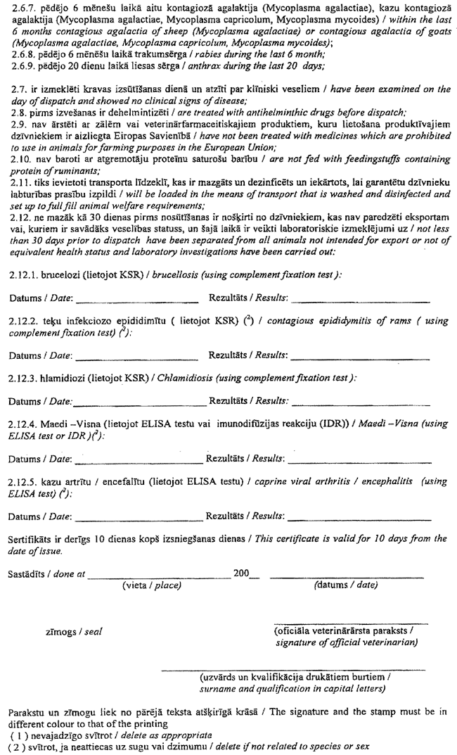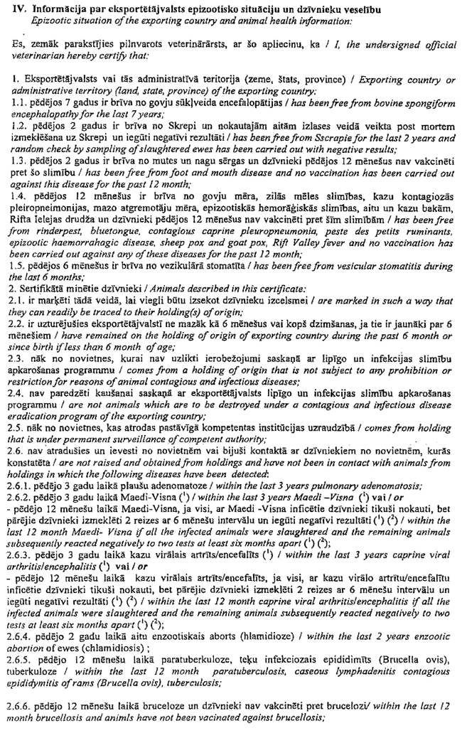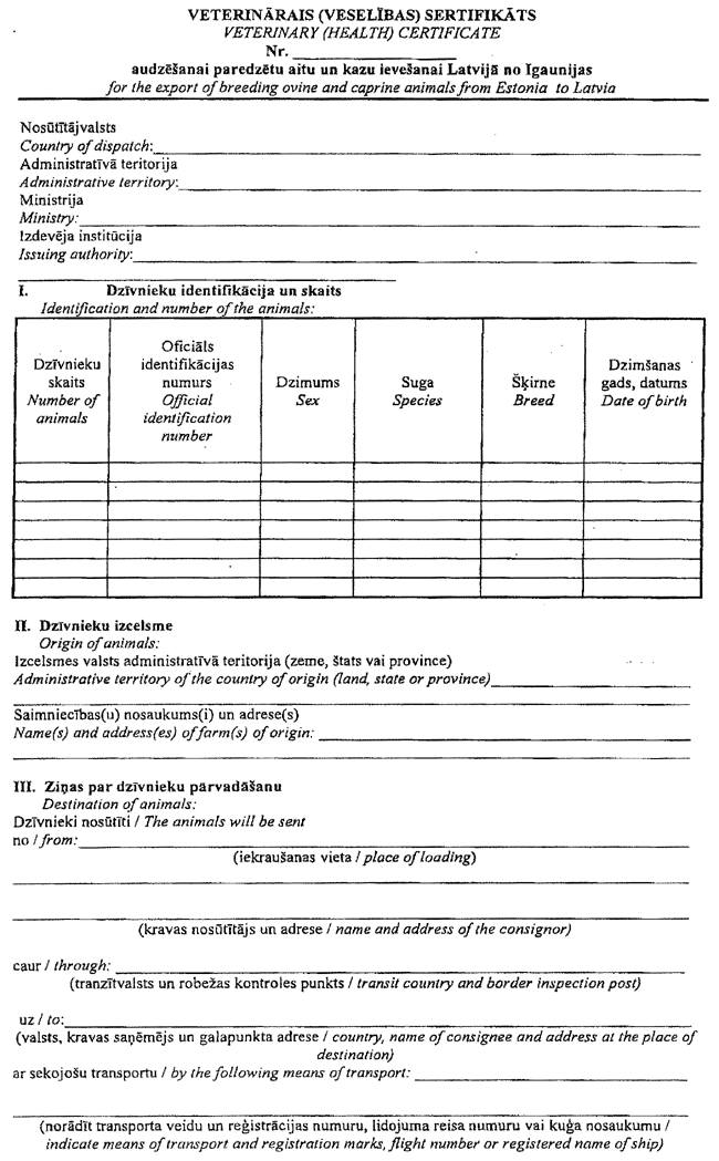 1. Latvijā audzēšanai paredzētas aitas un kazas no Igaunijas atļauts ievest ar Igaunijas Veterinārā un pārtikas dienesta izdotu noteikta parauga veterināro (veselības) sertifikātu (pielikums).