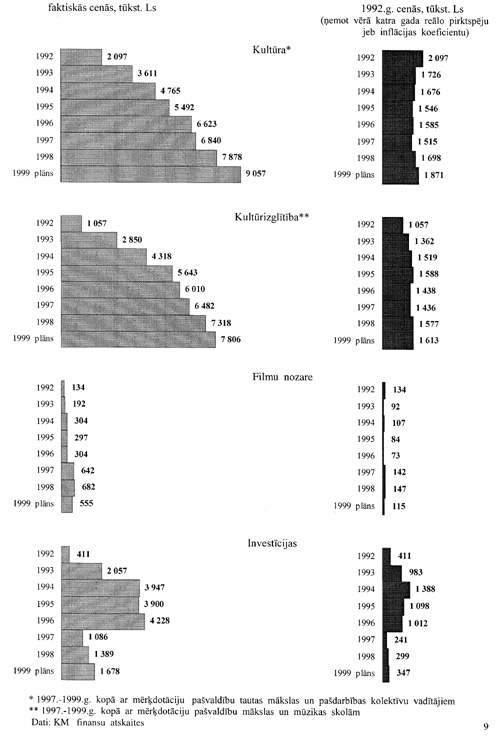 Kultūrai Latvijā bīstamākais laiks bija deviņdesmito gadu sākums, kad tautsaimniecības lejupslīdes dēļ valsts vairs nespēja finansēt iepriekšējos gados izveidoto kultūras infrastruktūru un darbības veidu. Laikā no 1992. līdz 1997. gadam kultūras reālais finansējums samazinājās (1.1. zīmējums).