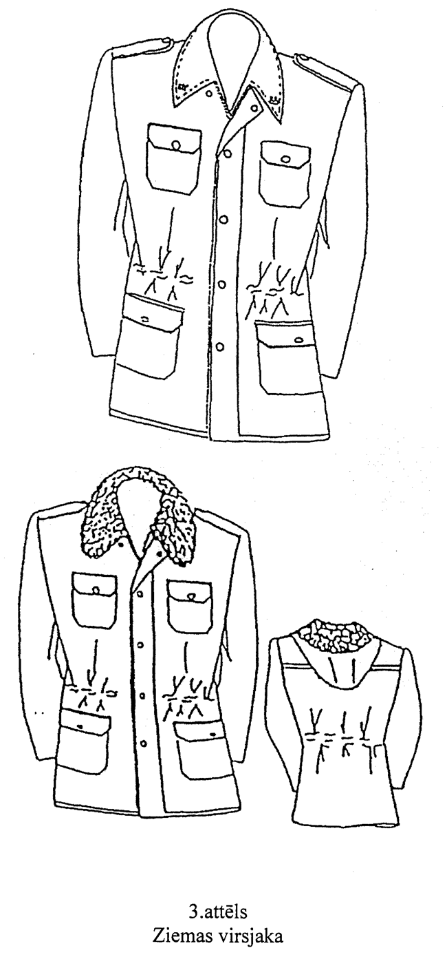 7. Ziemas virsjaka (3.attēls). Pagarināta taisna silueta ūdensnecaurlaidīga auduma virsjaka ar siltinātu atpogājamu oderi un melnu mākslīgās kažokādas apkakli (pulkvežu virsjakām — piepogājama karakulādas apkakle melnā krāsā), četrām uzšūtām (divām krūšu un divām sānu) kabatām ar spiedpogu pārloku, divām iegrieztām kabatām (iekškabatas). Priekšpuse ar rāvējslēdzēju un piecu spiedpogu aizdari. Iešūtas divvīļu piedurknes ar piešūtām trikotāžas aprocēm. Uz plecu vīlēm — uzpleči (ar dienesta pakāpes atšķirības zīmēm), kuru viens gals iešūts piedurknes vīlē, bet otrs piepogājams ar vienu pogu (diametrs — 14 mm). Iešūta atlokāma apkakle, apkakles stūros — zīmotne “LV”. Ar rāvējslēdzēju piestiprināma kapuce ar oderi. Virsjakas jostas daļā — no iekšpuses savelkama josta.
