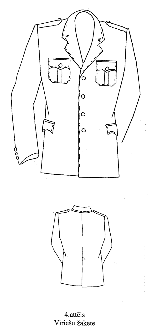8. Vīriešu žakete (4.attēls). Taisna silueta pusvilnas auduma žakete ar divām uzšūtām krūšu kabatām ar vienu pogu (diametrs — 22 mm) katrā pārlokā, divām iegrieztām sānu kabatām ar pārloku un divām iekškabatām. Priekšpuse ar vienrindas četru pogu (diametrs — 22 mm) aizdari. Iešūta apkakle ar atlokiem. Iešūtas vienvīles piedurknes ar trim apdares pogām (diametrs — 14 mm). Uz plecu vīlēm — uzpleči (ar dienesta pakāpes atšķirības zīmēm), kuru viens gals iešūts piedurknes vīlē, bet otrs piepogājams ar vienu pogu (diametrs — 14 mm). Apkakles stūros — zīmotne “LV”.