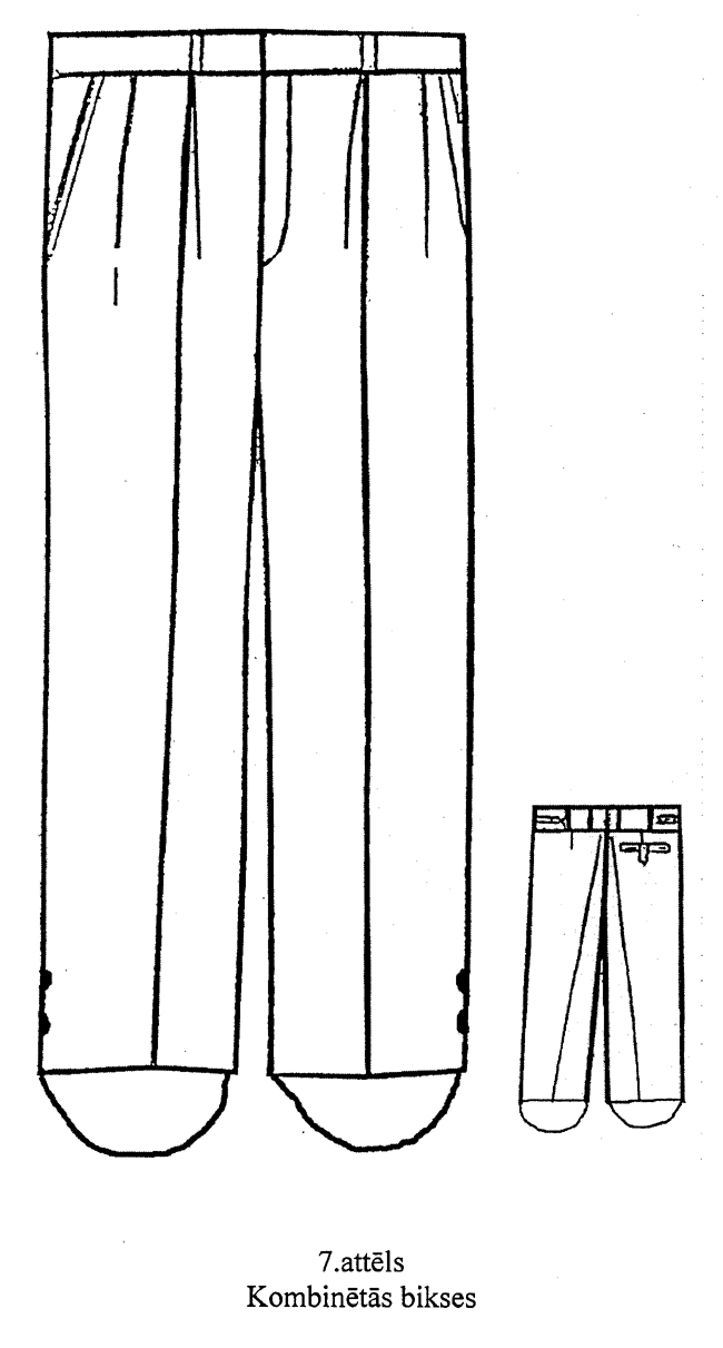 11. Kombinētās bikses (7.attēls). Pusvilnas auduma bikses ar vidukļa līnijā piešūtu jostu, rāvējslēdzēja aizdari priekšpusē (vidus vīlē), divām pogām bikšu sašaurinātajā apakšdaļā un pēdsloksni (valkāšanai zābakos) ar divām pogām. Uz jostas — astoņas cilpas un divi savilktņi. Priekšpuse ar divām ielocēm (pa vienai katrā pusē) un divām ieslīpām kabatām. Mugurpuse ar divām iešuvēm un vienu iegriezto kabatu ar cilpu un pogu.