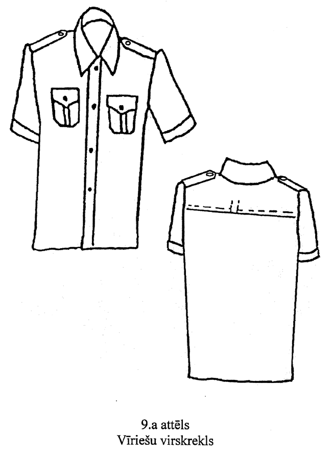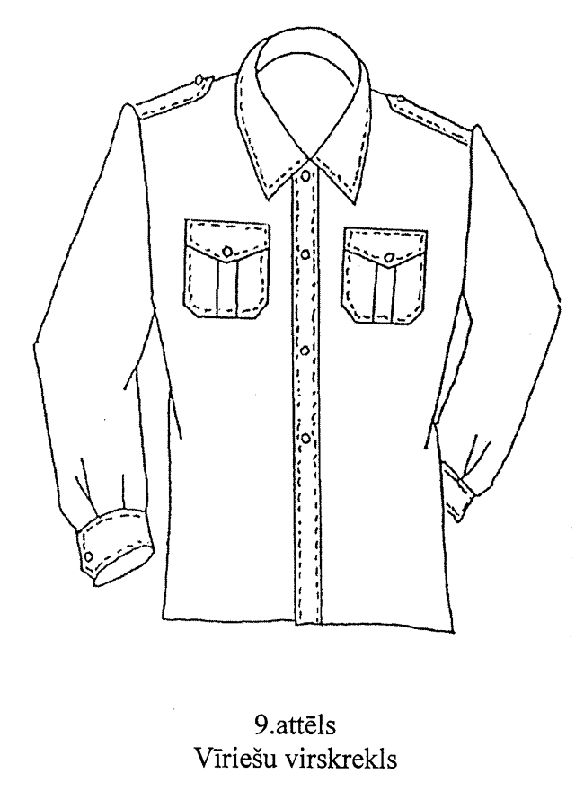 9. Virsjaka (5.attēls). Pusvilnas auduma virsjaka ar vienrindas triju pogu (diametrs — 22 mm) aizdari un vienas pogas (diametrs — 22 mm) aizdari uz jostas. Priekšpuse ar divām uzšūtām krūšu kabatām ar pārloku un divām iekškabatām. Pārloks piepogājams ar vienu pogu (diametrs — 22). Mugurpuse ar piešūtu atdaļu un divām vertikālām ielocēm. Piedurknes ar piešūtu aproci un divu pogu (diametrs — 14 mm) aizdari. Uz plecu vīlēm — uzpleči (ar dienesta pakāpes atšķirības zīmēm), kuru viens gals iešūts piedurknes vīlē, bet otrs piepogājams ar vienu pogu (diametrs — 14 mm). Iešūta apkakle ar atsevišķi piegrieztu stāvdaļu. Apkakles stūros — zīmotne “LV”. Virsjakas apakšmala ar jostu, kuras sānu daļās iestrādāta gumija.