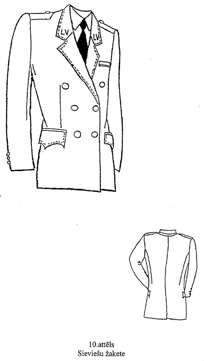 15. Sieviešu žakete (10.attēls). Pieguļoša silueta pusvilnas auduma žakete ar nobīdīto divu pogu (diametrs — 22 mm) aizdari un četrām apdares pogām (diametrs — 22 mm). Priekšpuse ar četrām iešuvēm un divām iegrieztām sānu kabatām ar pārlokiem. Kreisajā pusē augšā — iegrieztā kabata ar līstīti. Mugurpuse ar vīli. Iešūtas divvīļu piedurknes. Elkoņa vīle beidzas ar šķēlumu un trim apdares pogām (diametrs — 14 mm). Uz plecu vīlēm — uzpleči (ar dienesta pakāpes atšķirības zīmēm), kuru viens gals iešūts piedurknes vīlē, bet otrs piepogājams ar vienu pogu (diametrs — 14 mm). Iešūta atlokāma apkakle ar atsevišķi piegrieztu stāvdaļu. Apkakles stūros — zīmotne “LV”.