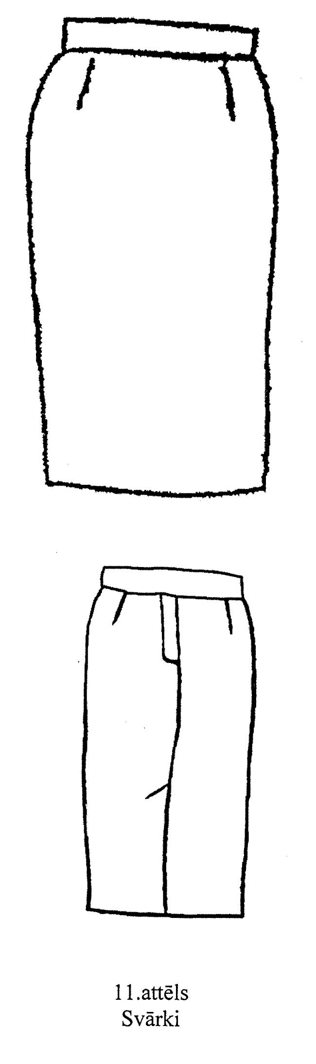 16. Svārki (11.attēls). Pusvilnas auduma svārki ar oderi, vidukļa līnijā piešūtu jostu un rāvējslēdzēja aizdari, mugurpuses vīlē uz jostas — vienas pogas aizdare. Priekšpuse ar divām iešuvēm. Mugurpuse ar divām iešuvēm, vīli un šķēlumu.