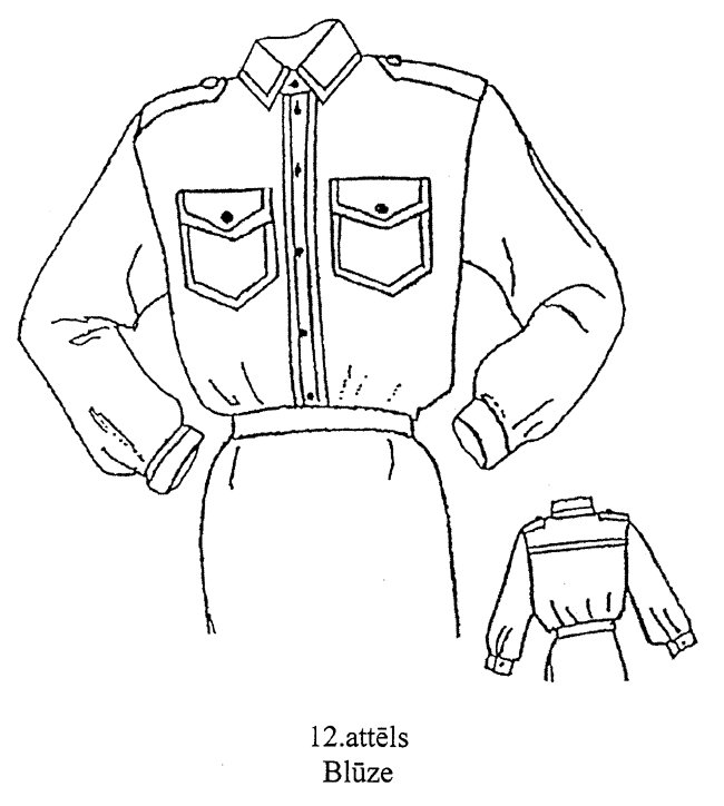 17. Sieviešu blūze (12. un 12.a attēls). Krekla auduma blūze ar vienrindas piecu pogu aizdari pa aizdarsloksni un vienu pogu uz apkakles stāvdaļas, divām uzšūtām krūšu kabatām ar vienu pogu katrā pārlokā, ar uzplečiem, kuru viens gals iešūts piedurknes vīlē, bet otrs piepogājams ar vienu pogu, un īsām vai garām piedurknēm. Mugurpuse ar piešūtu atdaļu. Iešūtas vienvīles piedurknes (blūze ar garām piedurknēm — ar piešūtu aproci un vienas pogas aizdari). Iešūta apkakle ar atsevišķi piegrieztu stāvdaļu.