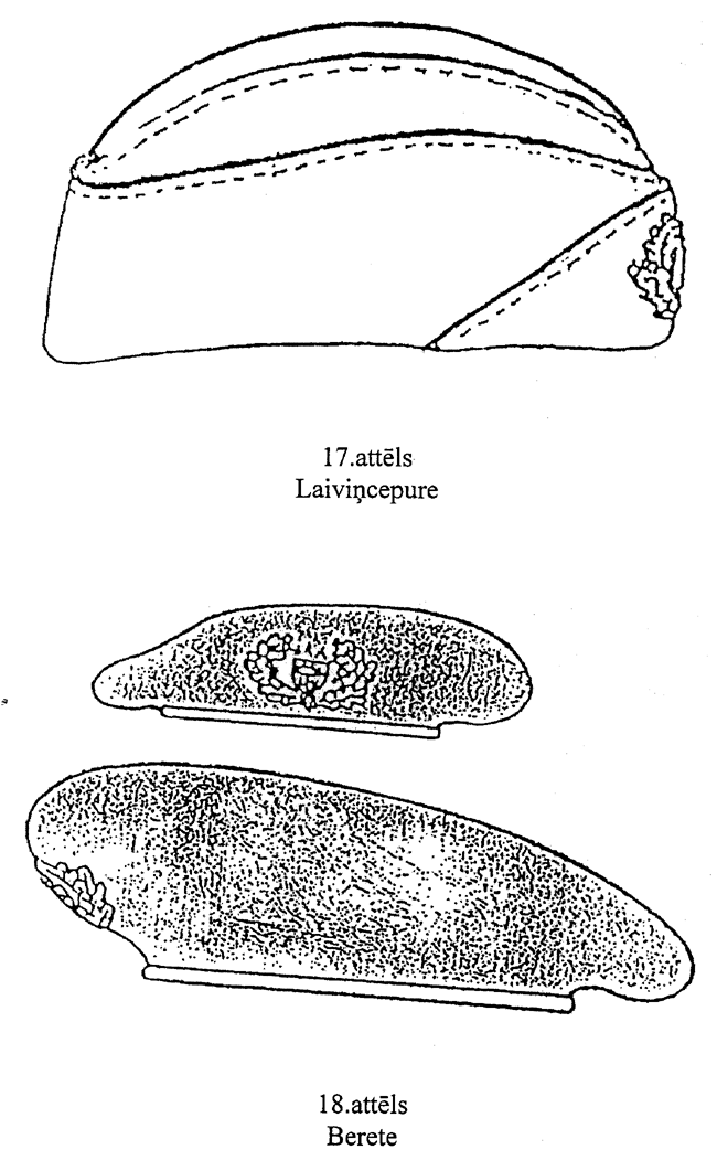 23. Laiviņcepure (17.attēls). Pusvilnas auduma cepure, ko veido divas sānsienas, pamatne un uzmala. Sānsienu pamatnes vīlē un gar uzmalu — apmalojums karmīnsarkanā krāsā. Priekšpuses vidū — kokarde.