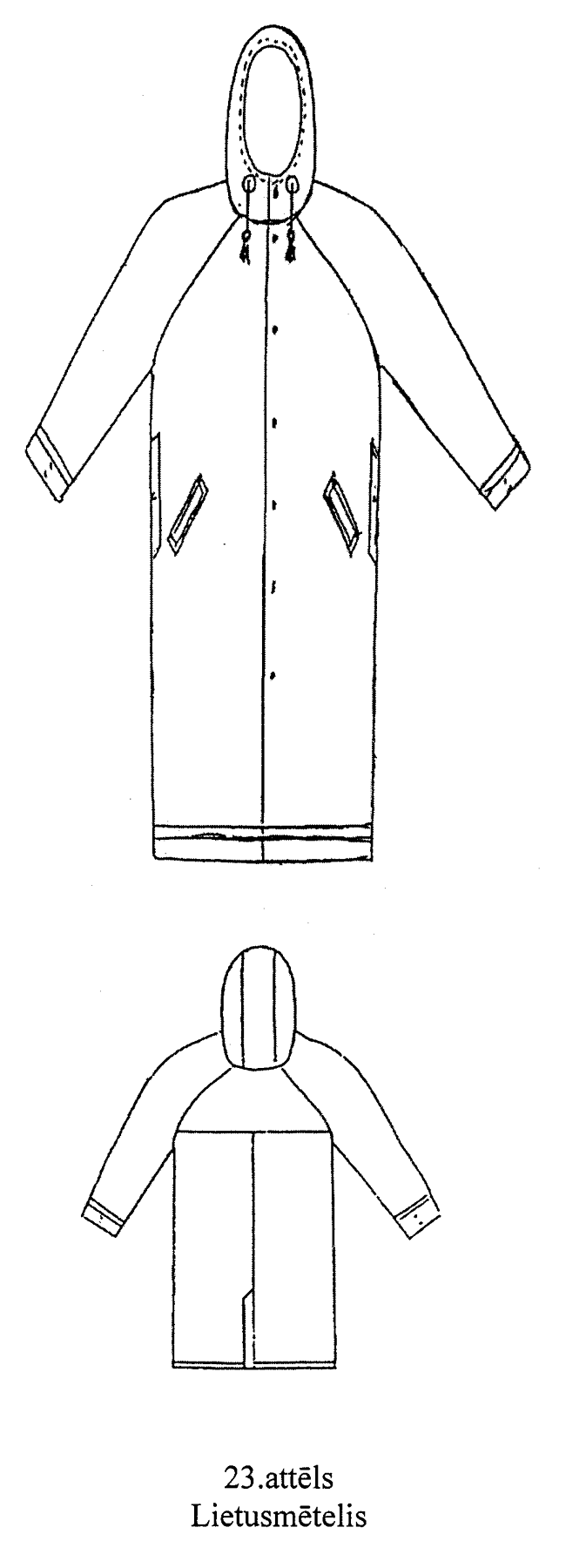 34. Lietusmētelis (23.attēls). Brīva silueta ūdensnecaurlaidīga auduma mētelis ar piešūtu kapuci. Priekšpuse ar septiņu spiedpogu aizdari, iegrieztām sānu kabatām un diviem roku izgriezumiem ar spiedpogu. Iešūtas vienvīles piedurknes.