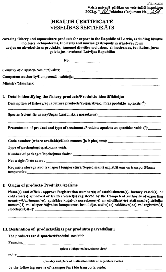 1. Latvijas Republikā zvejas un akvakultūras produktus, izņemot divvāku moluskus, ehinodermas, tunikātus, jūras galvkājus atļauts ievest ar kompetentās institūcijas izdotu noteikta parauga veselības sertifikātu (skat. pielikumā).
