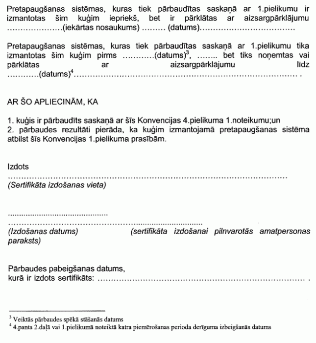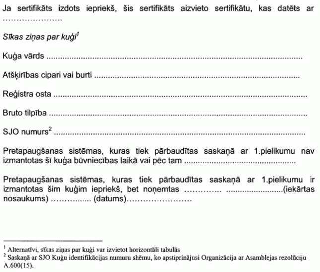 (3) Kuģiem, kuri izmanto pretapaugšanas sistēmas pirms stājas spēkā 1.pielikumā noteiktās pārbaudes, Administrācija izdod sertifikātu saskaņā ar šī noteikuma (2) un (3) daļu, ne vēlāk kā divus gadus pēc šīs pārbaudes spēkā stāšanās. Šī daļa nekādā veidā neietekmē prasības kuģiem, kuras tie pilda saskaņā ar 1. pielikumu.