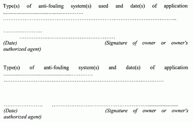 (1) Administrācija var lūgt, lai kuģiem, kuru garums ir 24 metri un vairāk, bet bruto tilpība ir mazāka par 400 BT, kuri nodarbināti starptautiskajā kuģošanā un kuriem piemērojama 3.panta 1.daļas (a) punkta (izņemot fiksētās vai peldošās platformas, peldošās noliktavas (FSUs) un peldošās produktu noliktavas un pārkraušanas platformas (FPSOs)) būtu kuģa īpašnieka vai īpašnieka pilnvarota pārstāvja parakstīta deklarācija. Šādai deklarācijai pievienojami atbilstoši dokumenti (tādi kā krāsojuma čeks vai darbuzņēmēja pavadzīme) vai jāietver attiecīgs apstiprinājums.
