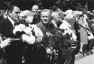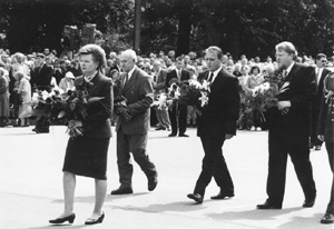 Tas nenozīmē, ka mēs kā tauta dzīvojam tikai sērās un domās par savu pagātni. Taisni otrādi, izrādot cieņu tiem mūsu vidū, kas ir piedzīvojuši netaisnību, mēs tikai augstāk ceļam paši savas valsts un savas nācijas godu. Mēs apliecinām savu lepnumu par to, ka piederam Latvijas valstij un Latvijas tautai. Mēs apliecinām to, ka viņu ciešanas nebūs bijušas veltīgas, jo tā valsts, kuras vārdā viņi dabūja ciest, tā valsts, kuras vārdā viņi tika netaisni sodīti, lūk, tā valsts tagad ir atdzimusi. Mēs esam par viņu atbildīgi, mēs gādāsim, lai viņa paliek visas pasaules brīvo valstu kopienā. Mēs visi kopā gādāsim, lai tā būtu tāda valsts, kā jūs, pārdzīvotāji, kā jūs, cietēji, savā laikā to bijāt cerējuši. Tas ir mūsu svētākais pienākums. Un to mēs uzņemamies, un par to mēs gādāsim.