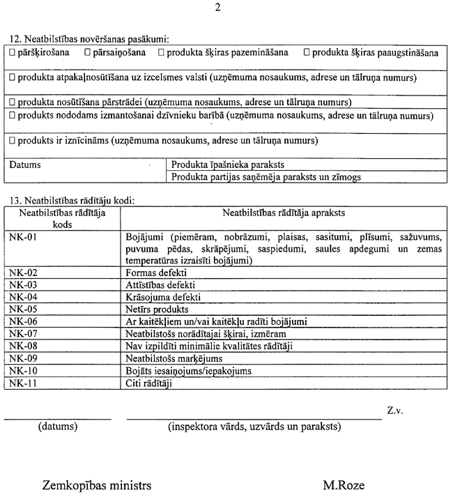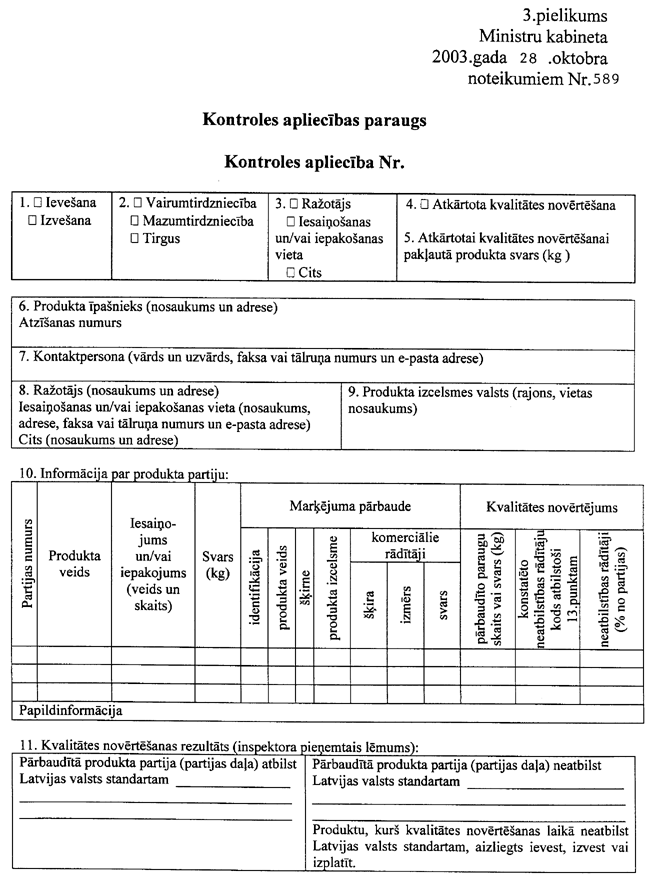 12. Ja veikta produkta kvalitātes un klasifikācijas uzraudzība un kontrole kādā no pārtikas aprites posmiem iekšējā tirgū vai atkārtoti novērtēta produkta atbilstība kvalitātes un klasifikācijas prasībām, inspektors izraksta kontroles apliecību (3.pielikums).