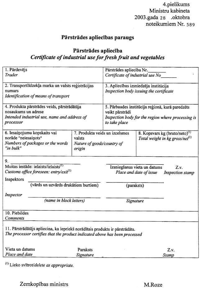 13. Latvijā ievedamam un no Latvijas izvedamam produktam, kas paredzēts pārstrādei, inspektors izraksta pārstrādes apliecību (4.pielikums). Attiecīgajam produktam atbilstība piemērojamam standartam nav nepieciešama. Dienests uzrauga un kontrolē, lai pārstrādei paredzētie produkti netiktu realizēti tirgū mazumtirdzniecībā un tirdzniecības uzņēmumos.