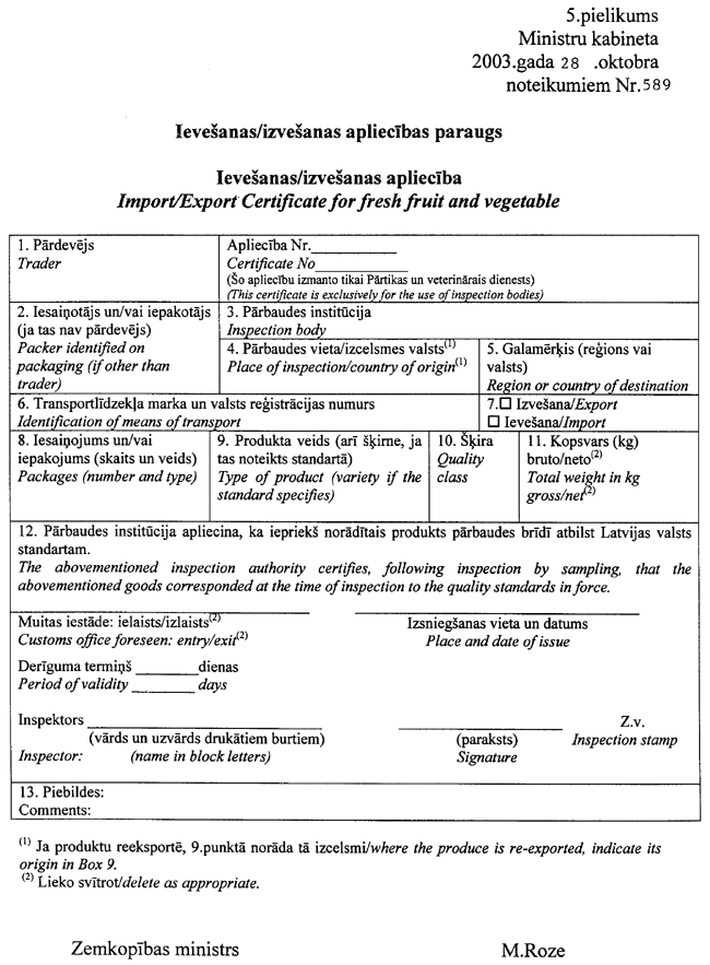 14. Ja Latvijā ražotais produkts paredzēts izvešanai (izņemot saskaņā ar šo noteikumu 13.punktu no Latvijas izvedamos produktus) un atbilst attiecīgajam piemērojamam standartam, inspektors izraksta ievešanas/izvešanas apliecību (5.pielikums).