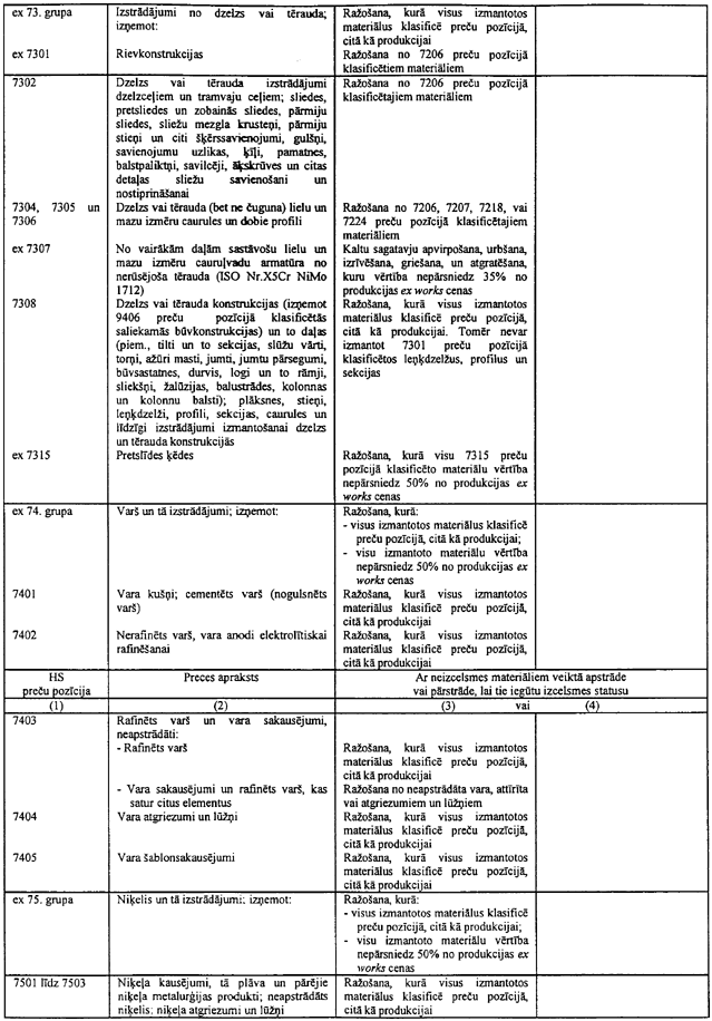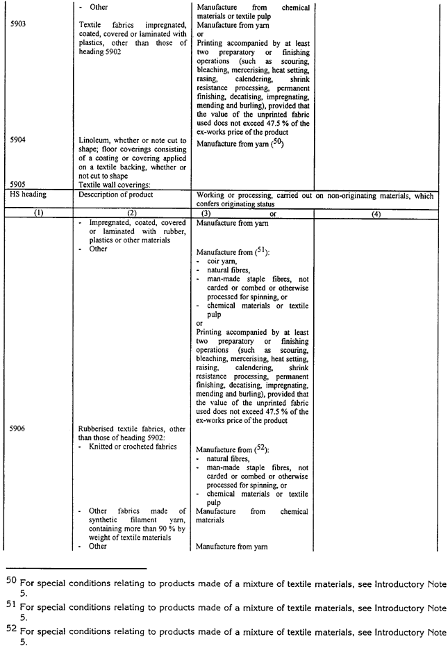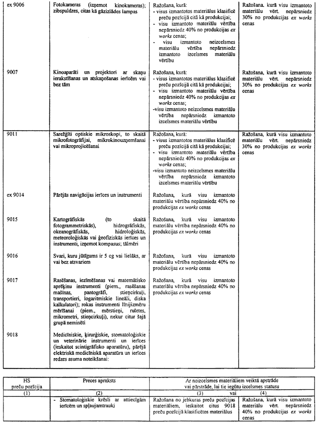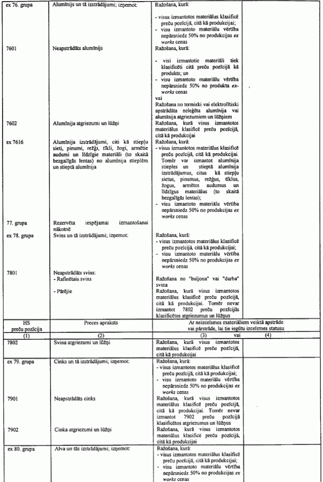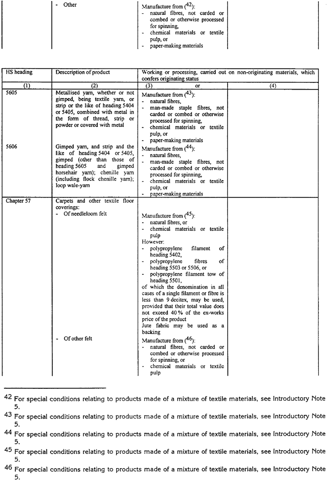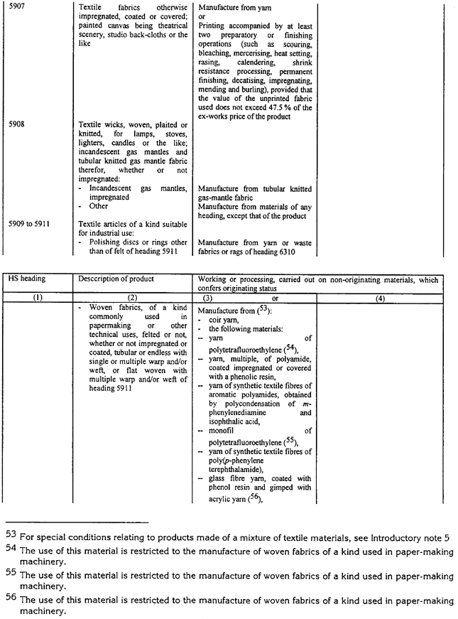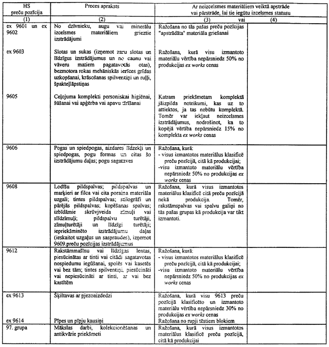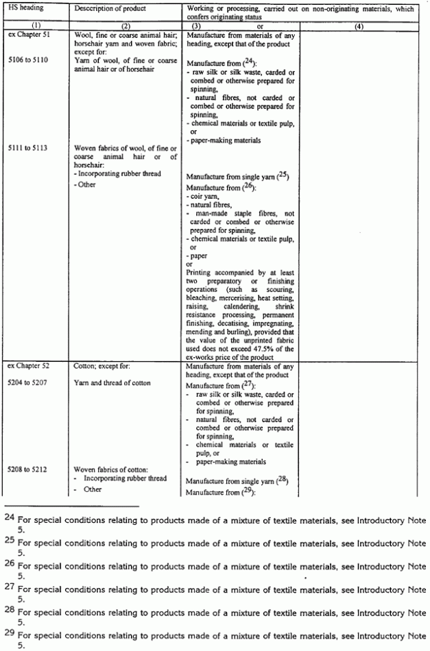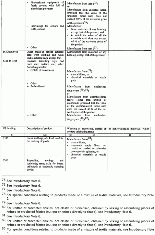 Ja noteikums tabulā nosaka, ka noteiktam tekstila priekšmetam, piemēram, biksēm, jāizmanto dzija, tas neliedz izmantot metāla priekšmetus, piemēram, pogas, jo pogas netiek klasificētas 50. līdz 63. grupās. Tāda paša iemesla dēļ, tas neliedz izmantot rāvējslēdzējus pat tad, ja šie rāvējslēdzēji parasti satur tekstilu.