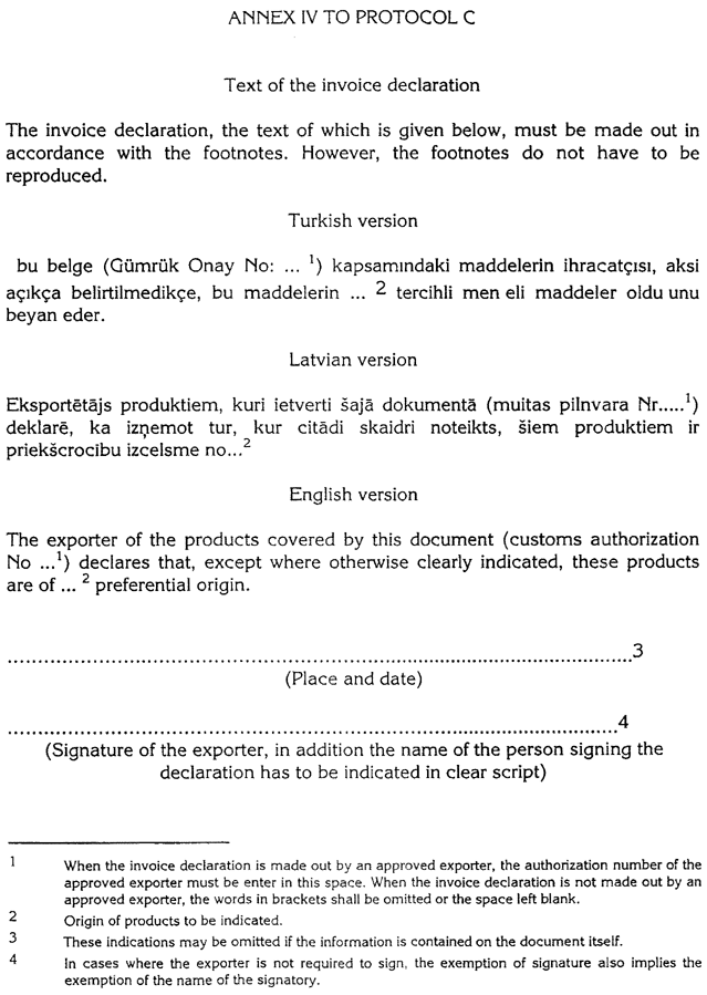 Having regard to the Free Trade Agreement between the Republic of Latvia and the Republic of Turkey, signed on 16 June 1998 (hereinafter referring as "Agreement") and Protocol C concerning the definition of the concept of the "originating products" and methods of administrative cooperation to this Agreement (hereinafter called Protocol C),