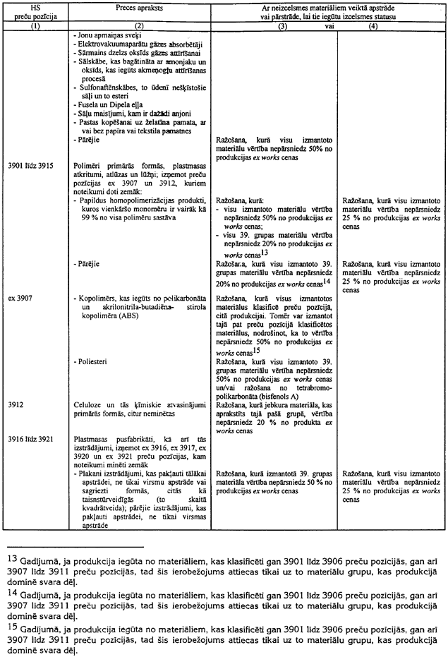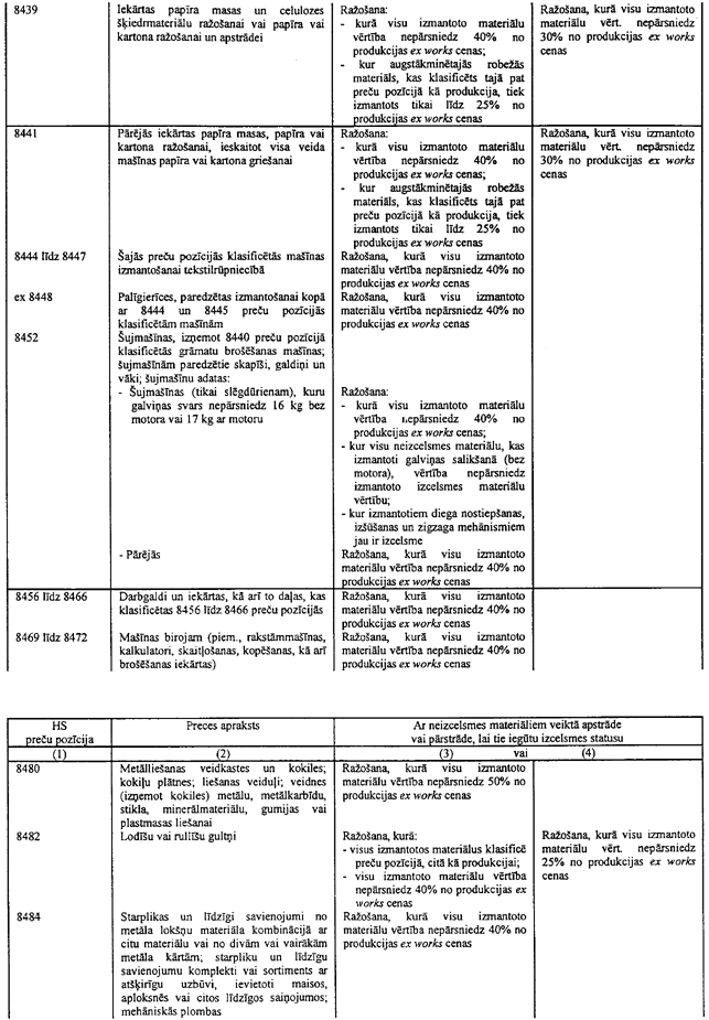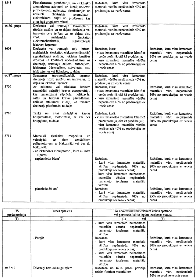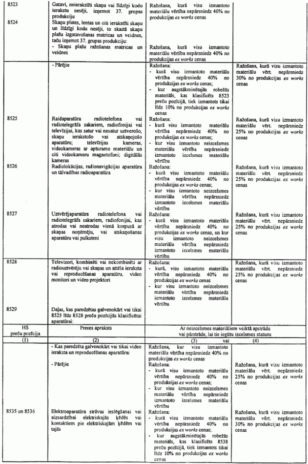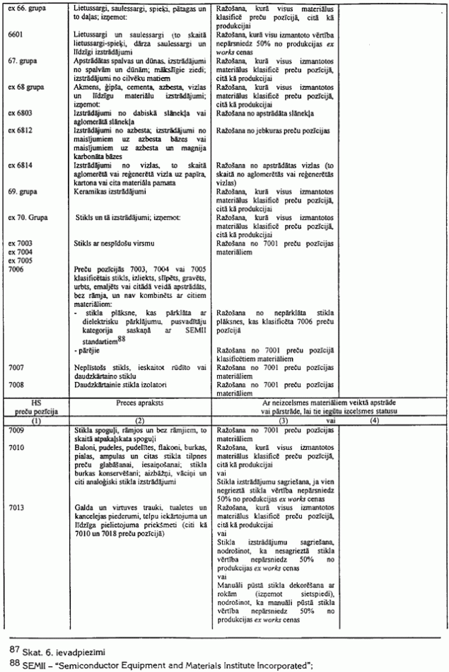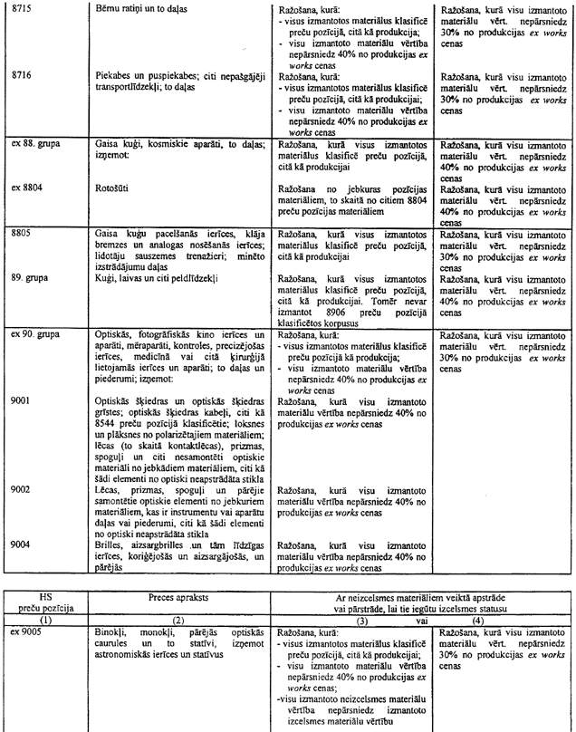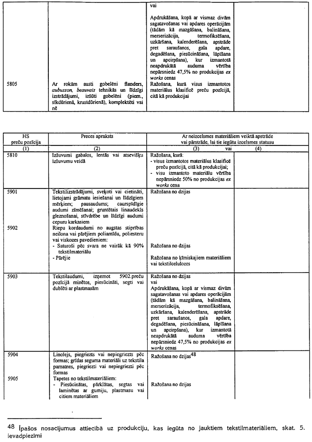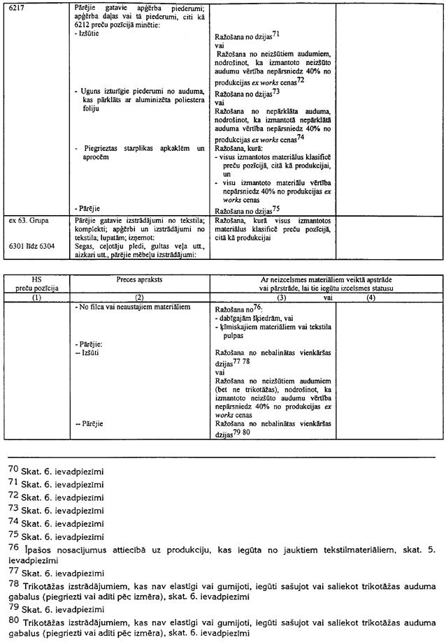 6.1. Ja tabulā ir atsauce uz šo piezīmi, tad var tikt izmantoti arī tekstila materiāli (izņemot oderes un starplikas), kas neatbilst šīs tabulas 3.ailes noteikumiem attiecīgajai gatavajai produkcijai, ar nosacījumu, ka tie tiek klasificēti citā pozīcijā, nekā produkcija, un ka to vērtība nepārsniedz 8% no šīs produkcijas ex works cenas.
