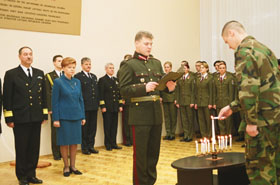 Nacionālajā aizsardzības akadēmijā Melnās kafijas vakarā 30.novembrī: kopā ar virsniekiem un kadetiem Nacionālo bruņoto spēku komandieris kontradmirālis Gaidis Andrejs Zeibots, Valsts prezidente Vaira Vīķe–Freiberga un Nacionālās aizsardzības akadēmijas dežūrvirsnieks kapteinis Valts Āboliņš Foto: Juris Krūmiņš |
