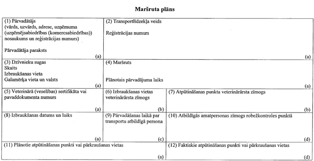18.1. pārvadātājs sagatavo maršruta plānu (1.pielikums). Maršruta plānā norāda dzīvnieku barošanas un dzirdināšanas vietas un laiku un ne vēlāk kā divas darbdienas pirms paredzamās pārvadāšanas iesniedz to saskaņošanai teritoriālajā struktūrvienībā;