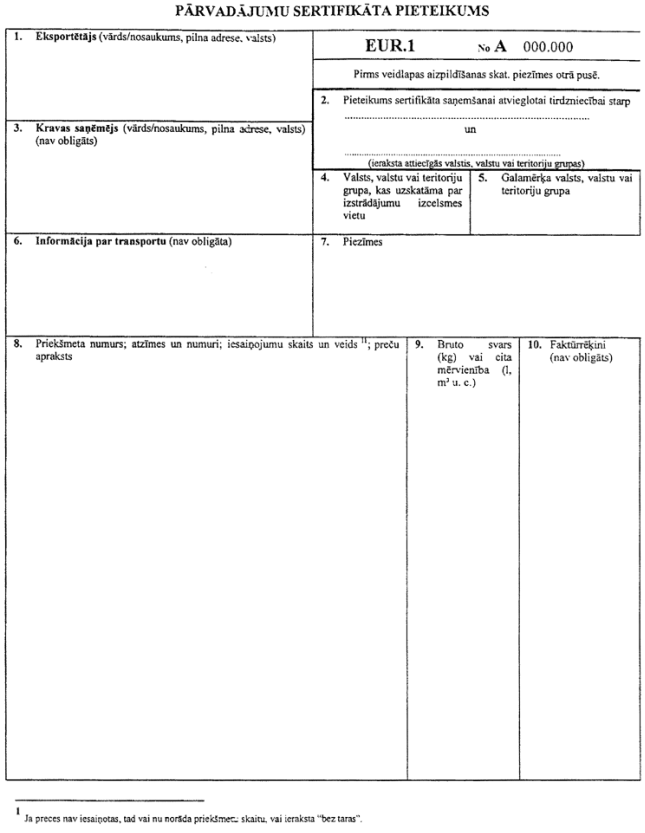 Pārvadājumu sertifikāta EUR 1 izdošanas procedūra |