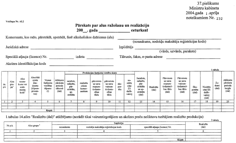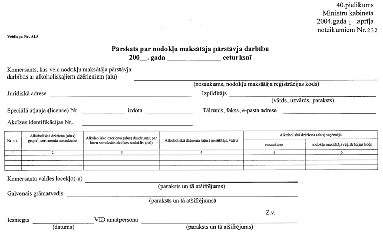 170. Komersants, kurš veic komercdarbību alus aprites jomā, pārskatu iesniedz reizi ceturksnī līdz ceturksnim sekojošā mēneša piecpadsmitajam datumam (36., 37., 38., 39. un 40.pielikums).