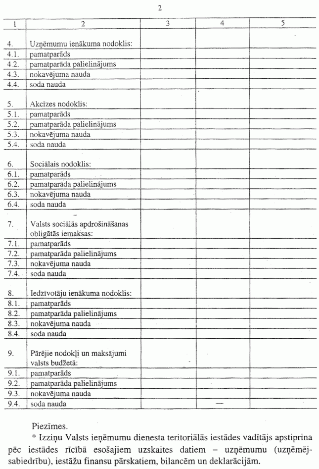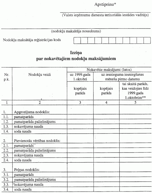 5.6. Valsts ieņēmumu dienesta teritoriālās iestādes vai Lielo nodokļu maksātāju pārvaldes izsniegtu izziņu, kurā pa nodokļu veidiem norādīti visi nokavētie nodokļu maksājumi (pamatparāds, pamatparāda palielinājuma nauda, nokavējuma nauda) uz iesnieguma iesniegšanas mēneša pirmo datumu, kā arī nokavēto valsts budžetā ieskaitāmo nodokļu maksājumu pamatparāds, pamatparāda palielinājuma nauda un nokavējuma nauda uz 1999.gada 1.oktobri, ar minēto pamatparādu saistītā pamatparāda palielinājuma nauda un nokavējuma nauda uz iesnieguma iesniegšanas mēneša pirmo datumu (1.pielikums);