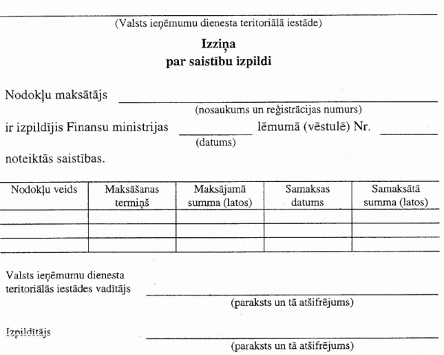 9. Desmit dienu laikā pēc lēmumā noteiktā termiņa beigām attiecīgā Valsts ieņēmumu dienesta teritoriālā iestāde vai Lielo nodokļu maksātāju pārvalde iesniedz Finansu ministrijā izziņu, kurā norādīts, kā nodokļu maksātājs ir izpildījis lēmumā noteiktās saistības (2.pielikums).