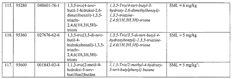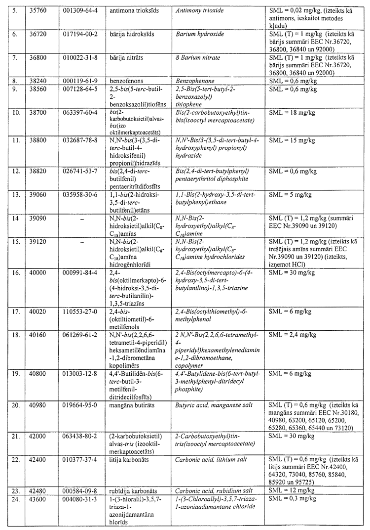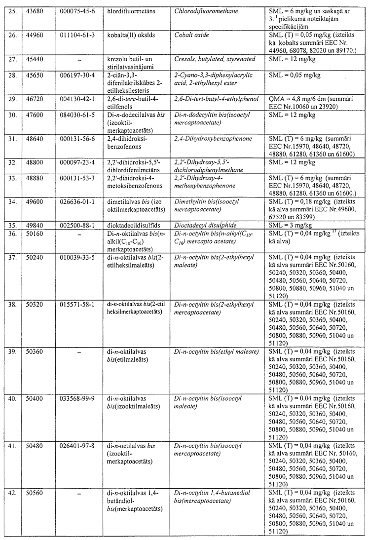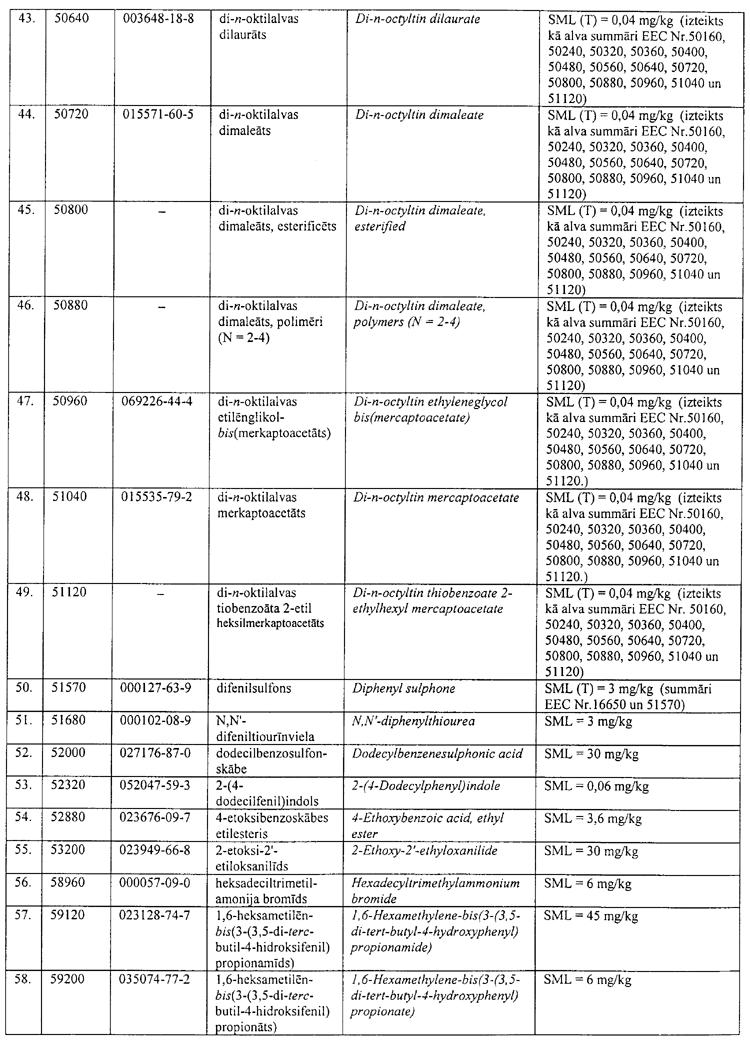 “2. Plastmasas materiālu un priekšmetu ražošanā atļautās piedevas (nepilnīgs saraksts), kuras var izmantot, ja ir veikta īpatnējās migrācijas robežas atbilstības pārbaude ar pārtikas aizstājēju D vai pārbaudāmajā vidē veikti aizstājējtesti saskaņā ar šiem noteikumiem:
