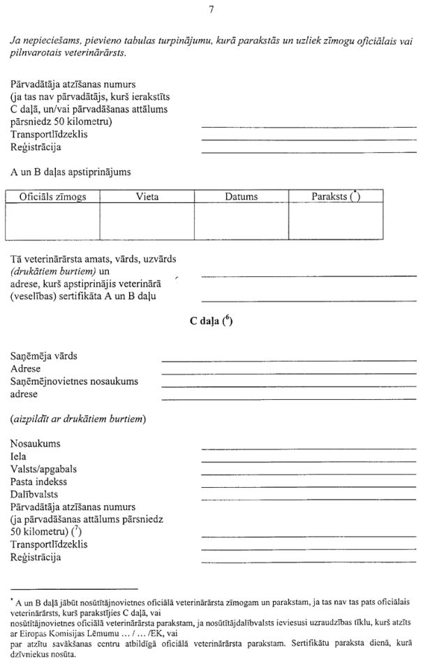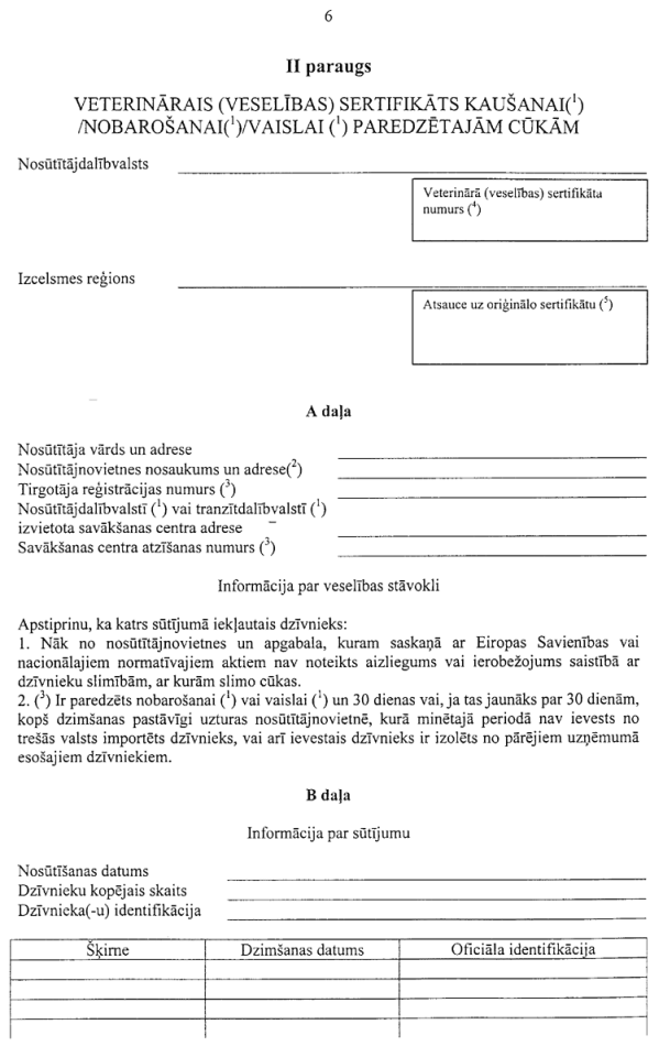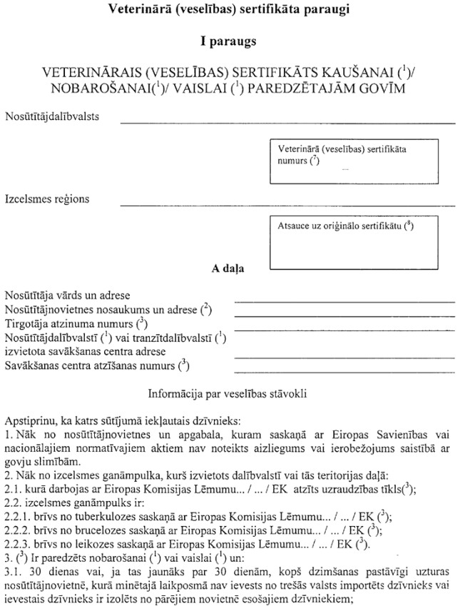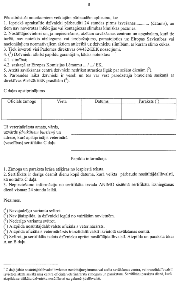 8.1. tas ir noformēts uz vienas vai vairākām papīra lapām. Ja veterinārais (veselības) sertifikāts sastāv no divām vai vairākām lapām, tad uz katras lapas norāda veterinārā (veselības) sertifikāta sērijas numuru;