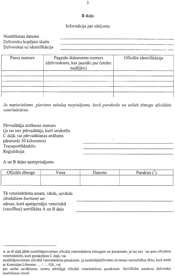 15.3. vedot govis un cūkas no tranzīta savākšanas centra, tām ir abu veterināro (veselības) sertifikātu oriģināli vai nosūtītājdalībvalsts oficiālā veterinārārsta aizpildīta veterinārā (veselības) sertifikāta oriģināls un tranzīta savākšanas centra atbildīgā oficiālā veterinārārsta aizpildīta veterinārā (veselības) sertifikāta apstiprināta kopija.