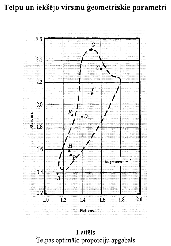 18. Telpas forma nodrošina maksimāli vienmērīgu (difūzu) skaņas lauka veidošanos, nepieļaujot skaņas koncentrācijas un stāvviļņu parādības un nodrošinot optimālas akustisko parametru vērtības. Telpas proporcijas var noteikt saskaņā ar šī būvnormatīva 2.pielikuma 1.attēlā norādīto apgabalu.