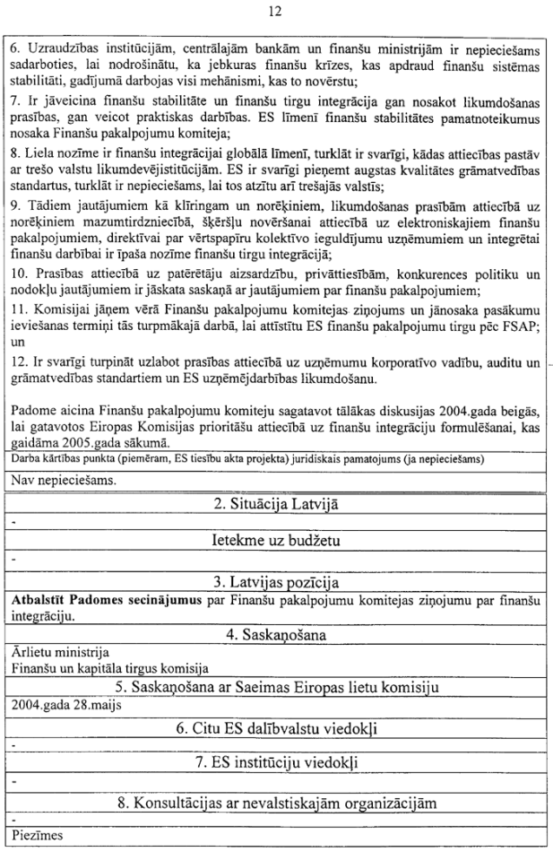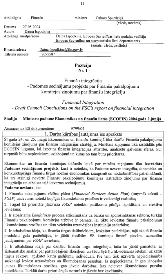 1.5. pozīcija Nr.1 “Padomes secinājumu projekts par Finanšu pakalpojumu komitejas ziņojumu par finanšu integrāciju”.