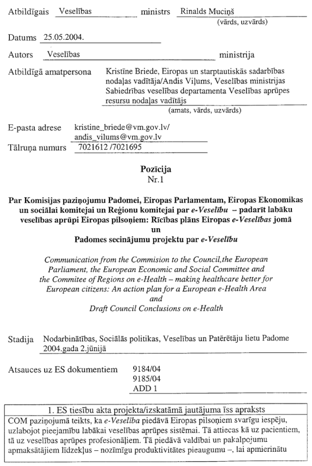 1.2. pozīcija Nr.1 “Par Komisijas paziņojumu Padomei, Eiropas Parlamentam, Eiropas Ekonomikas un sociālajai komitejai un Reģionu komitejai par e-Veselību — padarīt labāku veselības aprūpi Eiropas pilsoņiem: Rīcības plāns Eiropas e-Veselības jomā — un Padomes secinājumu projektu par e-Veselību”;