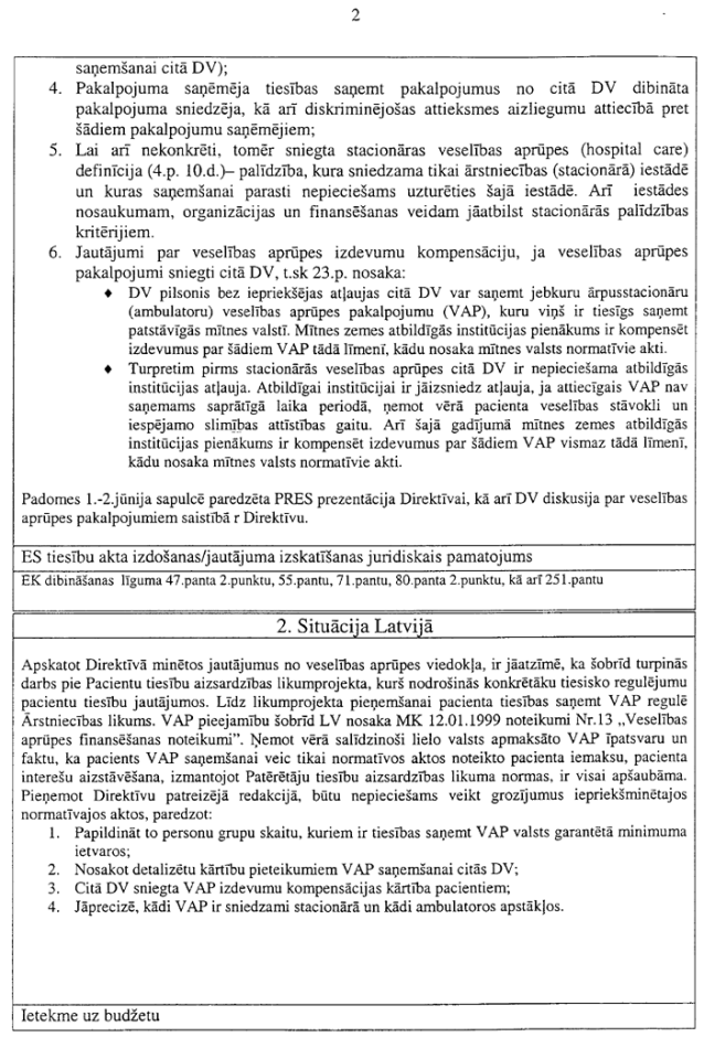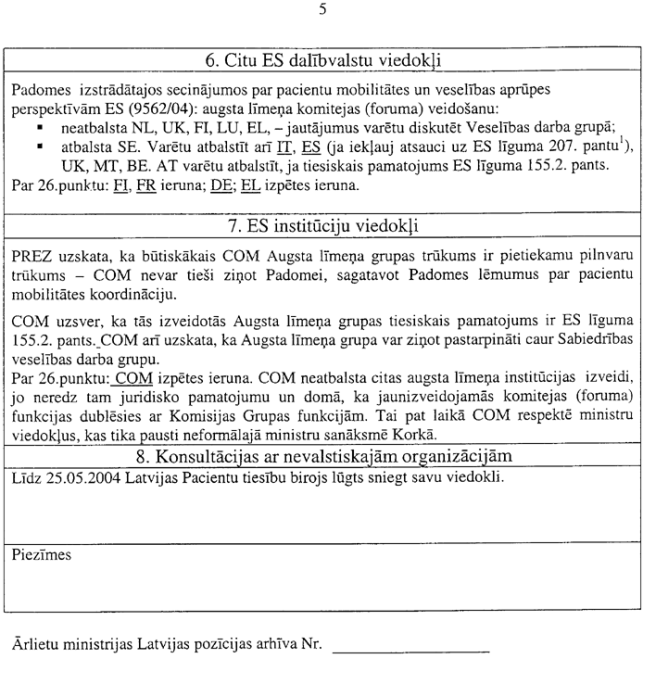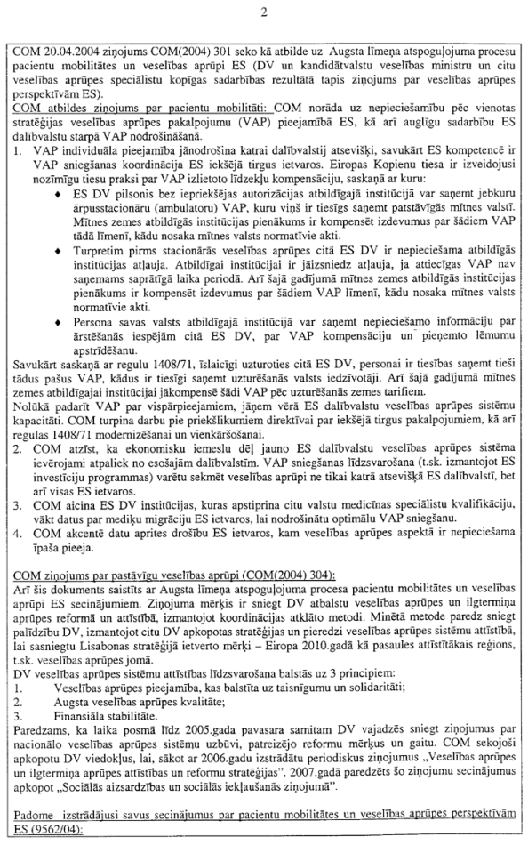 Eiropas Komisijas atbildes ziņojums par augsta līmeņa atspoguŗojuma procesu pacientu mobilitātes jomā un veselības aprūpi Eiropas Savienībā. Eiropas Komisijas ziņojums Padomei, Eiropas Parlamentam, Eiropas Ekonomikas un sociālajai komitejai, kā arī Reģionālajai komitejai par sociālās aizsardzības modernizēšanu nolūkā sasniegt augstas kvalitātes, pieejamu un pastāvīgu veselības aprūpi: atbalsts nacionālajām stratēģijām, pielietojot koordinācijas atvērto metodi. Padomes secinājumu projekts par pacientu mobilitāti un veselības aprūpes attīstību ES