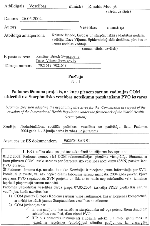 1.5. pozīcija Nr.1 “Padomes lēmuma projekts, ar kuru pieņem sarunu vadlīnijas COM attiecībā uz Starptautisko veselības noteikumu pārskatīšanu PVO ietvaros”;