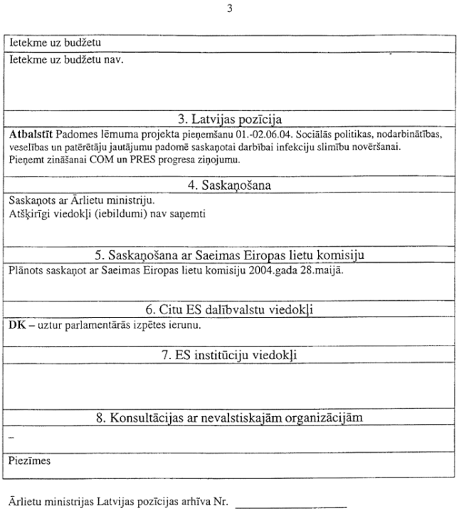 Par Latvijas pozīciju apstiprināšanu Eiropas Savienības Nodarbinātības, sociālās politikas, veselības un patērētāju lietu ministru padomes 2004.gada 1.–2. jūnija sanāksmē izskatāmajos Veselības ministrijas kompetencē esošajos jautājumos