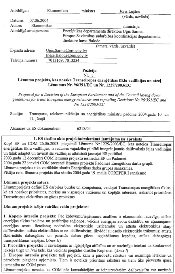 1.1. pozīcija Nr.1 “Lēmuma projekts, kas nosaka Transeiropas enerģētikas tīklu vadlīnijas un atceļ Lēmumu Nr.96/391/EC un Nr.1229/2003/EC”;