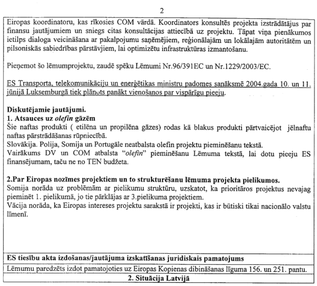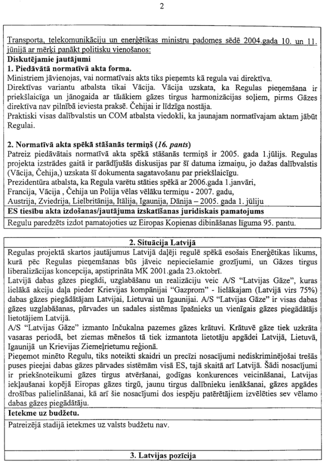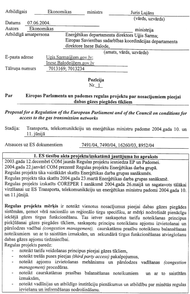 1.2. pozīcija Nr.1 “Eiropas Parlamenta un padomes regulas projekts par nosacījumiem pieejai dabas gāzes piegādes tīkliem”;